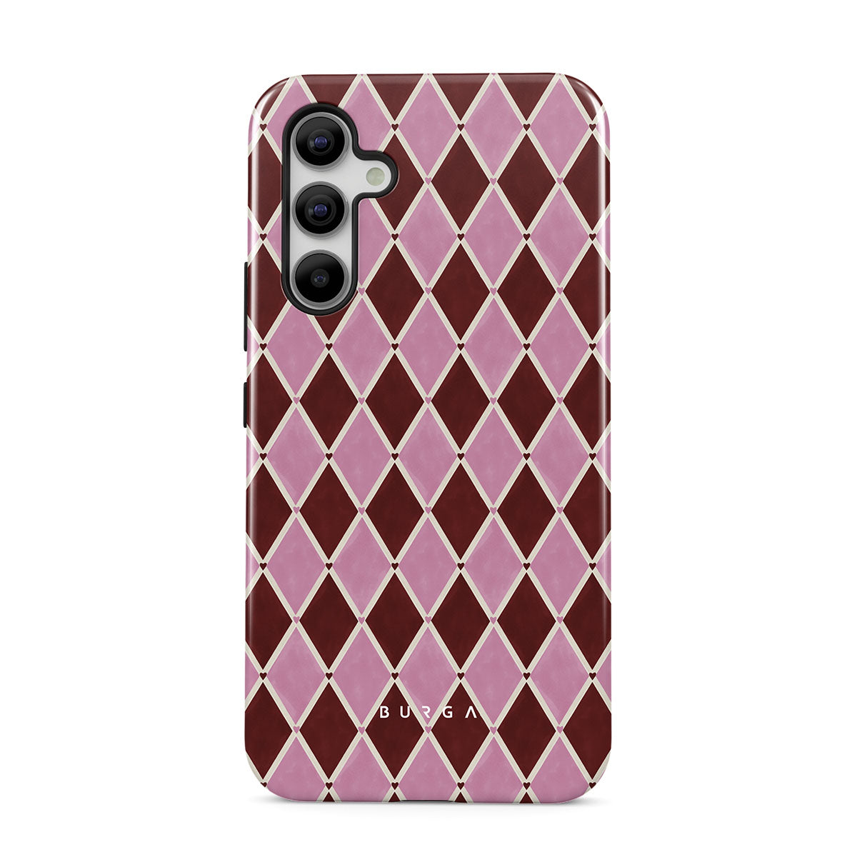 Kenmerken van dit design: harlekijnpatroon, roze ruiten, diep rode achtergrond