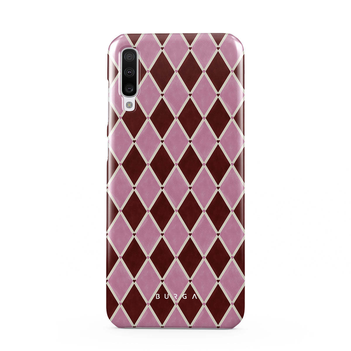 Kenmerken van dit design: harlekijnpatroon, roze ruiten, diep rode achtergrond
