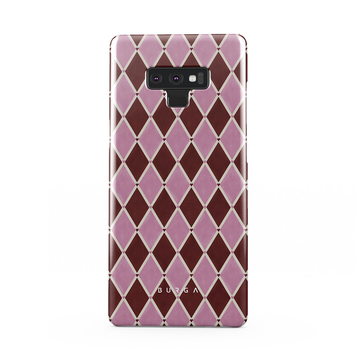 Kenmerken van dit design: harlekijnpatroon, roze ruiten, diep rode achtergrond