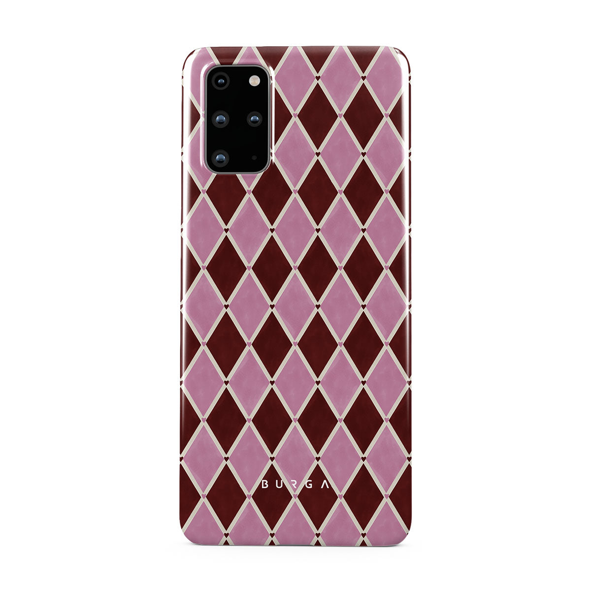 Kenmerken van dit design: harlekijnpatroon, roze ruiten, diep rode achtergrond