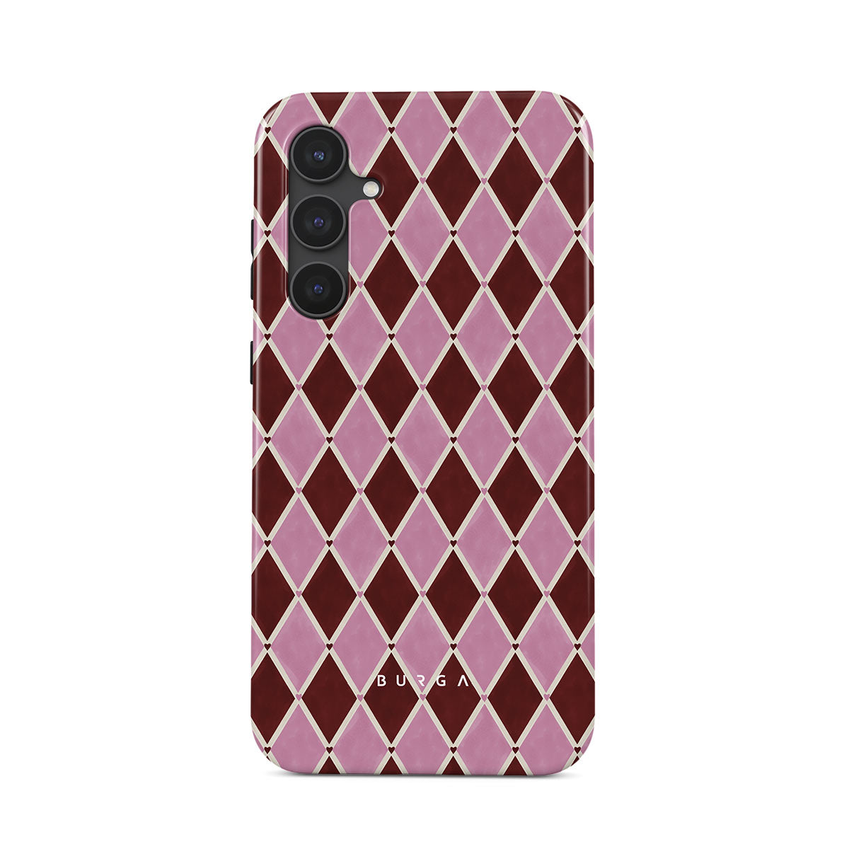Kenmerken van dit design: harlekijnpatroon, roze ruiten, diep rode achtergrond