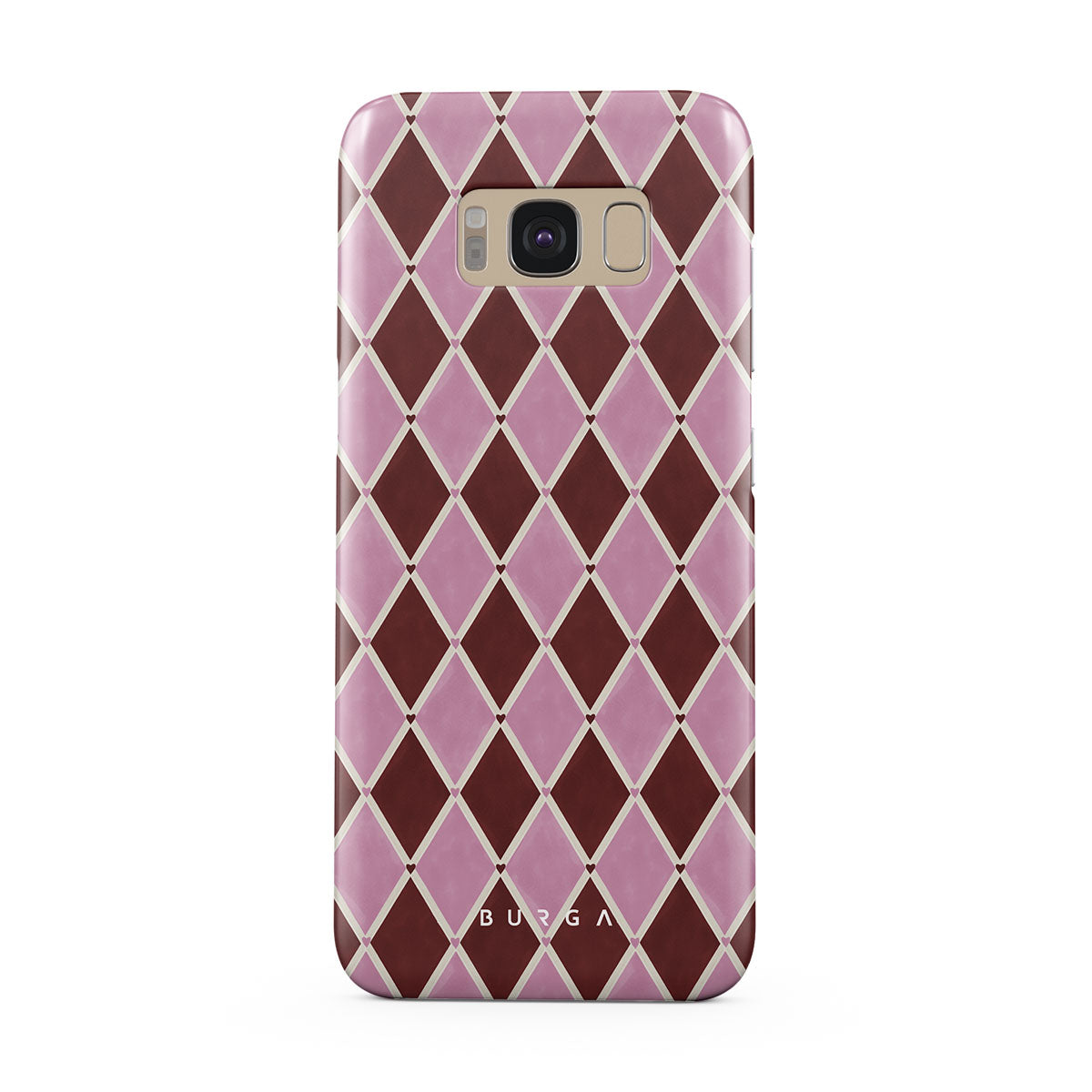 Kenmerken van dit design: harlekijnpatroon, roze ruiten, diep rode achtergrond