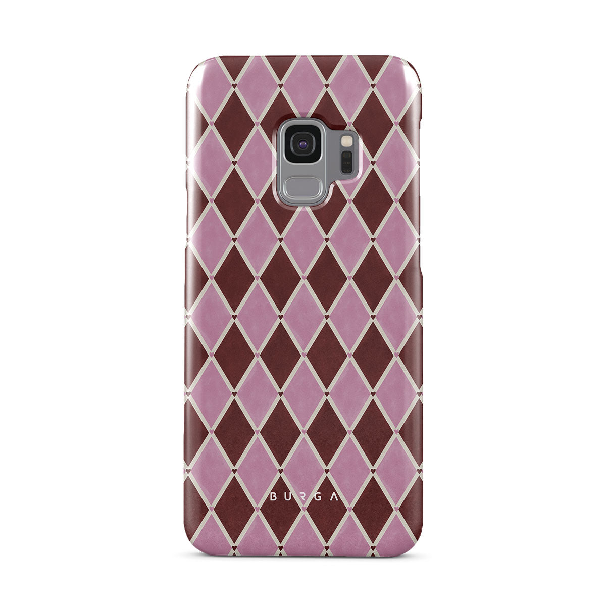 Kenmerken van dit design: harlekijnpatroon, roze ruiten, diep rode achtergrond