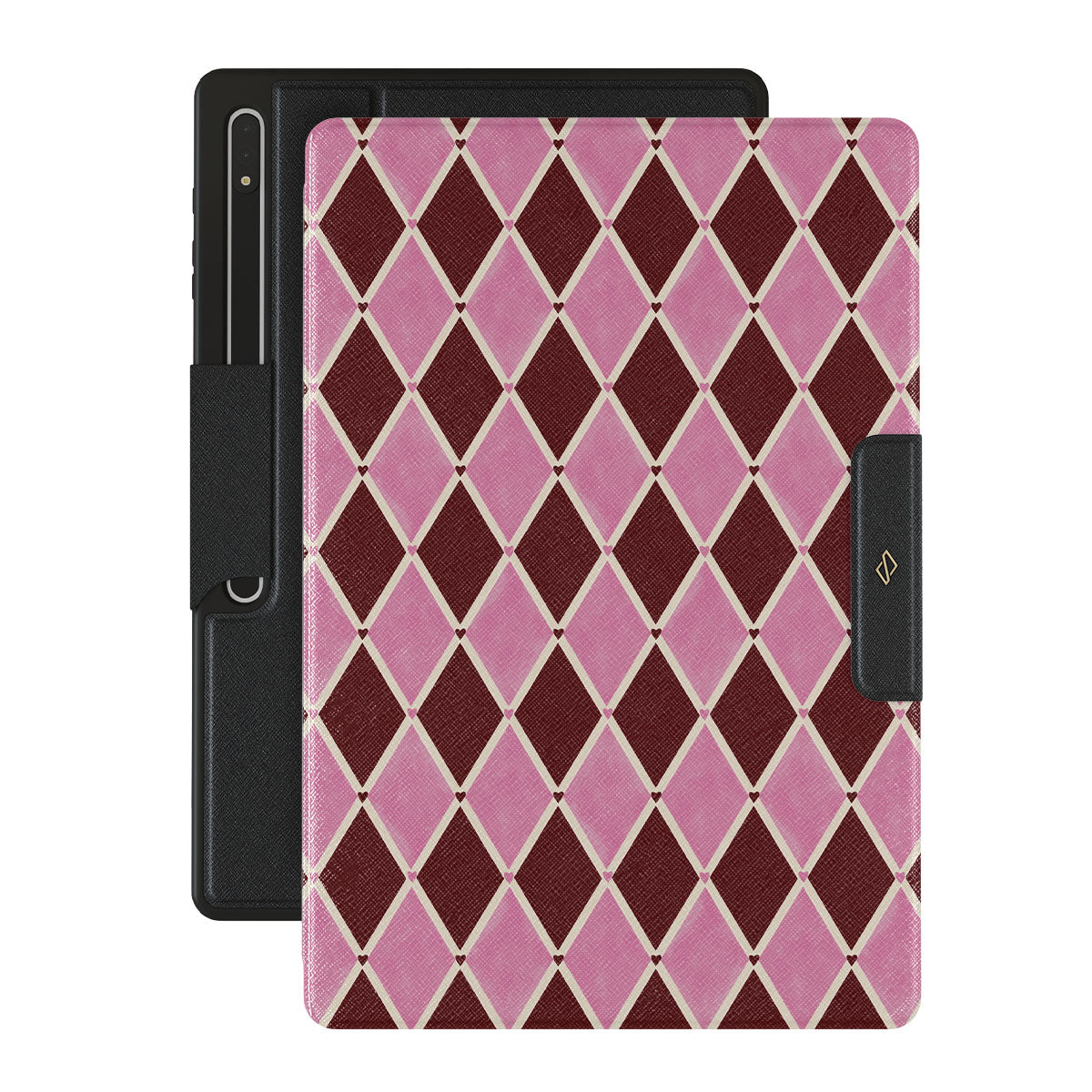 Kenmerken van dit design: harlekijnpatroon, roze ruiten, diep rode achtergrond