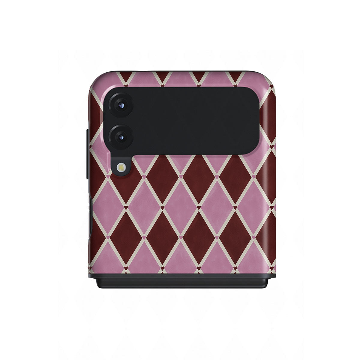 Kenmerken van dit design: harlekijnpatroon, roze ruiten, diep rode achtergrond