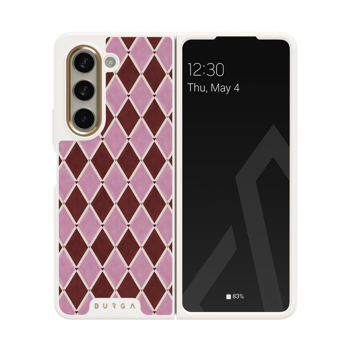 Kenmerken van dit design: harlekijnpatroon, roze ruiten, diep rode achtergrond