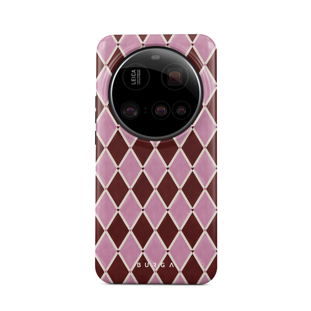Kenmerken van dit design: harlekijnpatroon, roze ruiten, diep rode achtergrond