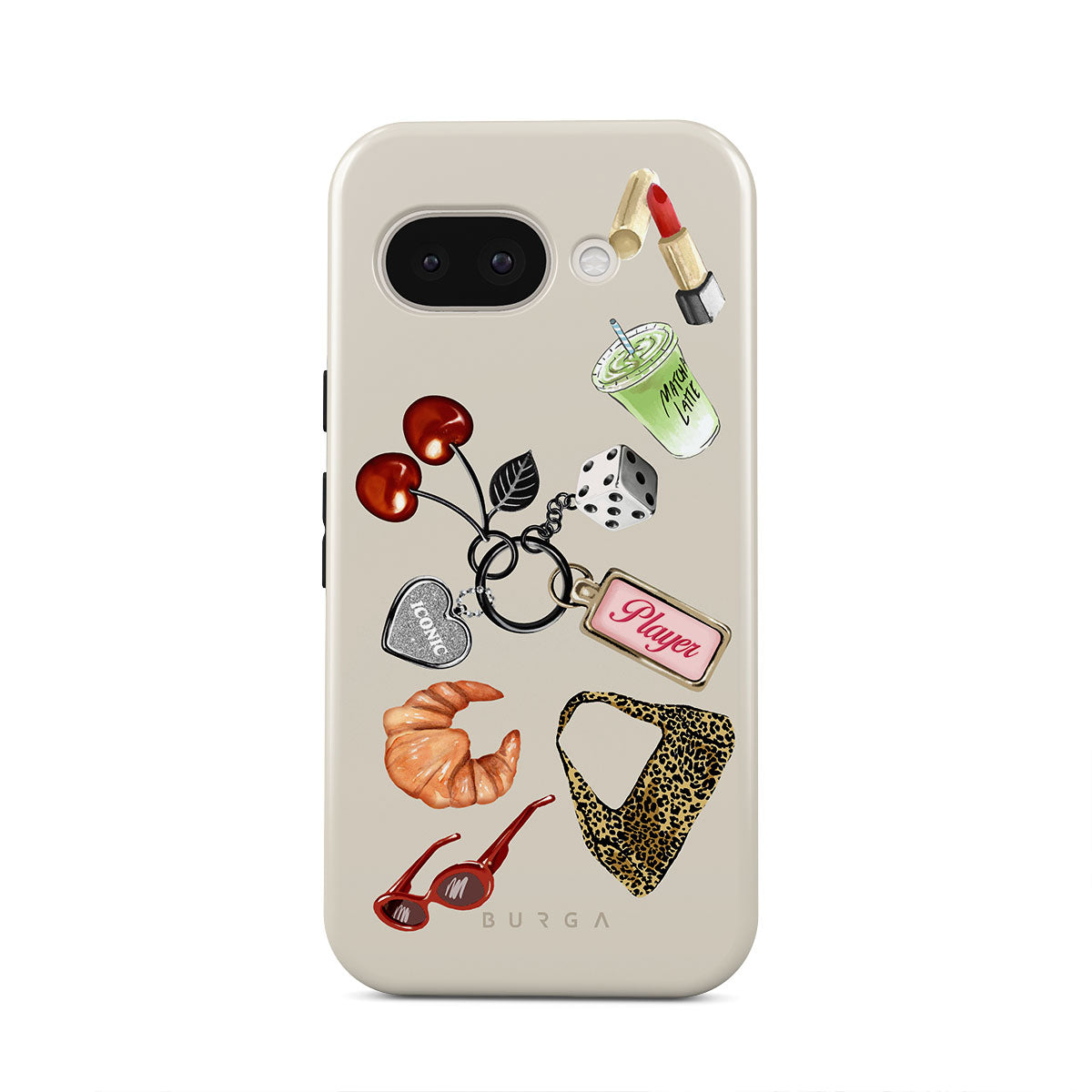 Kenmerken van dit design: rode zonnebril, rode lippenstift, groene matcha-drank, croissant, zwarte dobbelstenen, luipaardprint tas, sleutelhanger met zilveren hart, kersen, dobbelstenen en "Player"-tag.