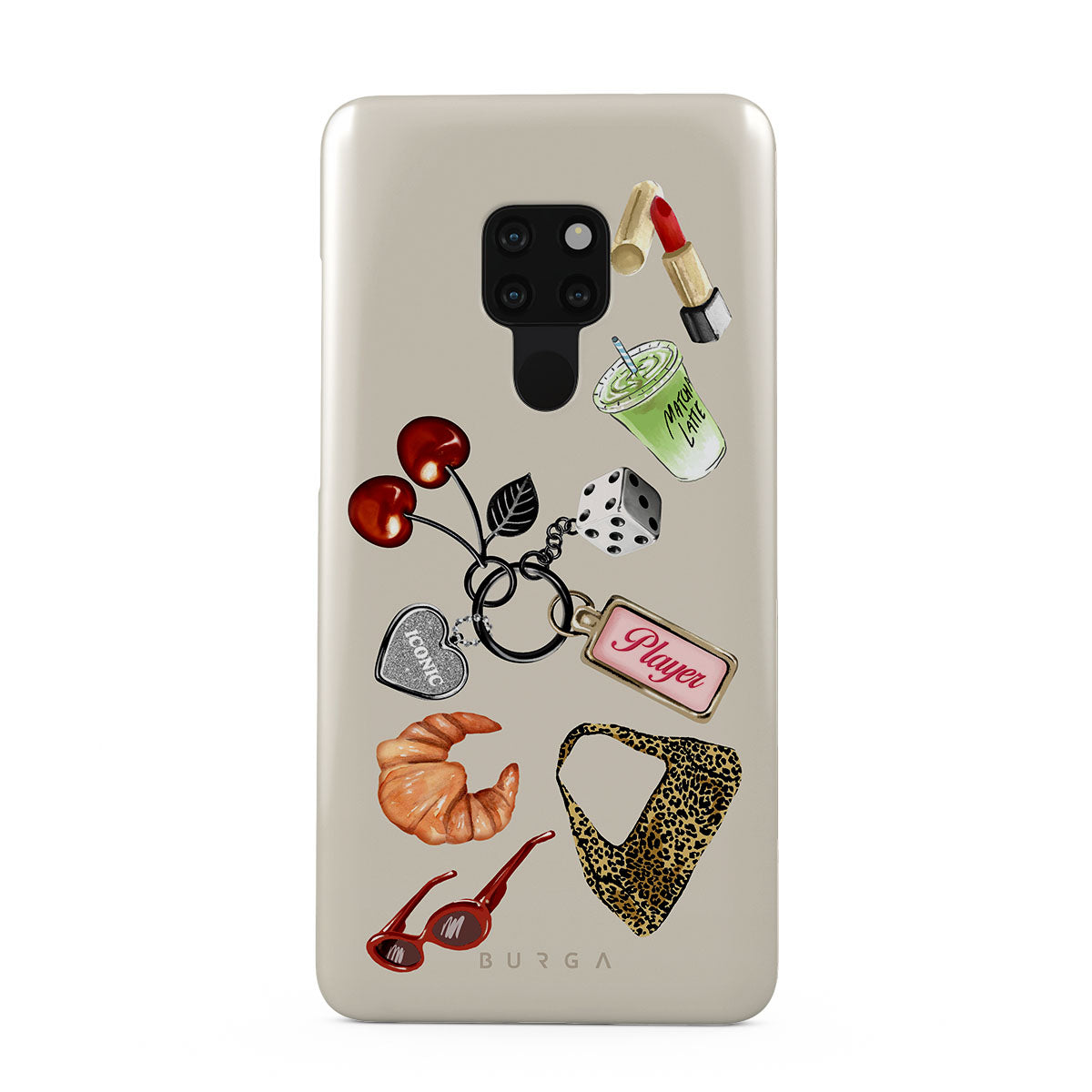 Kenmerken van dit design: rode zonnebril, rode lippenstift, groene matcha-drank, croissant, zwarte dobbelstenen, luipaardprint tas, sleutelhanger met zilveren hart, kersen, dobbelstenen en "Player"-tag.