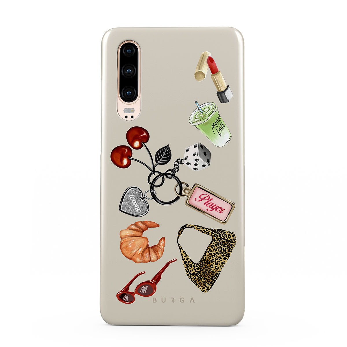 Kenmerken van dit design: rode zonnebril, rode lippenstift, groene matcha-drank, croissant, zwarte dobbelstenen, luipaardprint tas, sleutelhanger met zilveren hart, kersen, dobbelstenen en "Player"-tag.