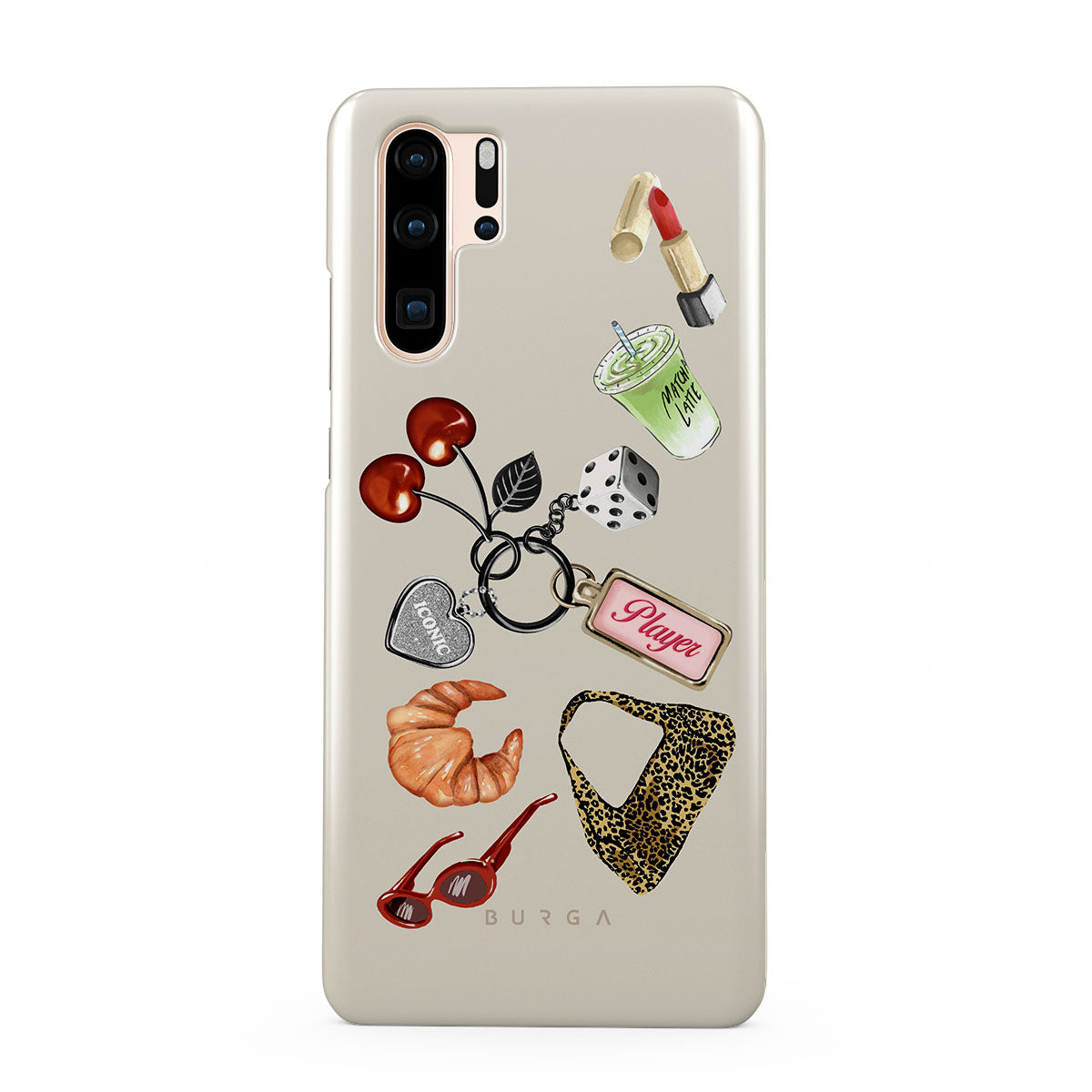 Kenmerken van dit design: rode zonnebril, rode lippenstift, groene matcha-drank, croissant, zwarte dobbelstenen, luipaardprint tas, sleutelhanger met zilveren hart, kersen, dobbelstenen en "Player"-tag.