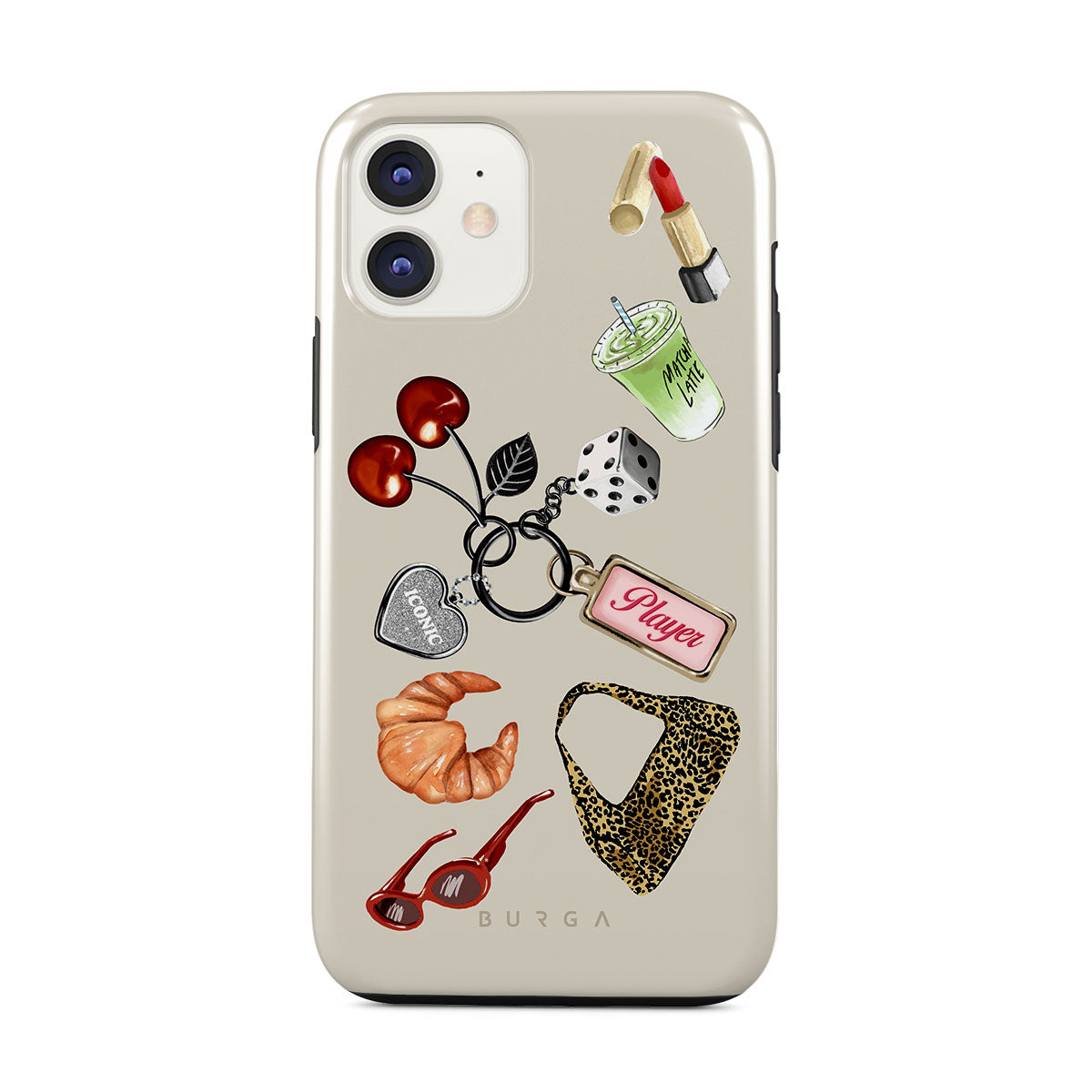 Kenmerken van dit design: rode zonnebril, rode lippenstift, groene matcha-drank, croissant, zwarte dobbelstenen, luipaardprint tas, sleutelhanger met zilveren hart, kersen, dobbelstenen en "Player"-tag.