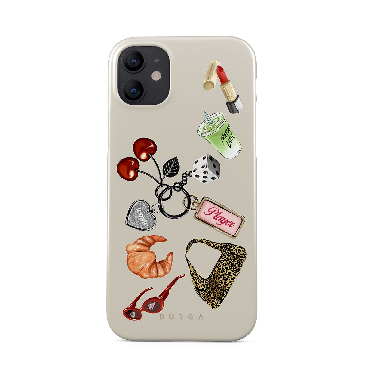 Kenmerken van dit design: rode zonnebril, rode lippenstift, groene matcha-drank, croissant, zwarte dobbelstenen, luipaardprint tas, sleutelhanger met zilveren hart, kersen, dobbelstenen en "Player"-tag.