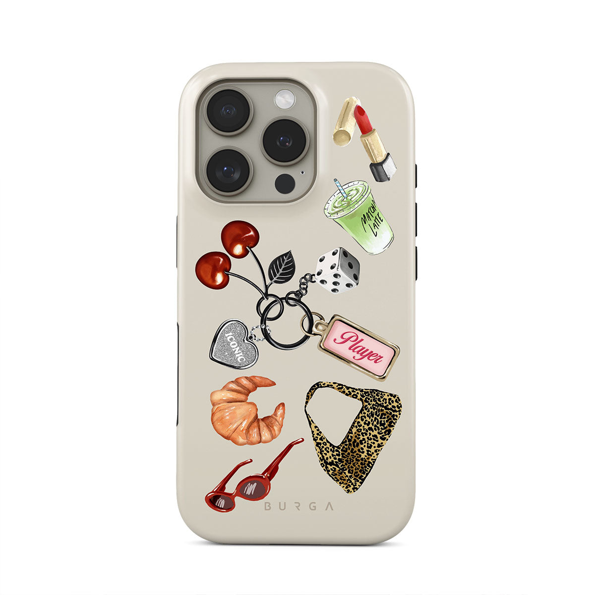 Kenmerken van dit design: rode zonnebril, rode lippenstift, groene matcha-drank, croissant, zwarte dobbelstenen, luipaardprint tas, sleutelhanger met zilveren hart, kersen, dobbelstenen en "Player"-tag.