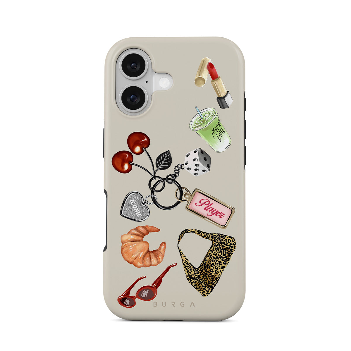 Kenmerken van dit design: rode zonnebril, rode lippenstift, groene matcha-drank, croissant, zwarte dobbelstenen, luipaardprint tas, sleutelhanger met zilveren hart, kersen, dobbelstenen en "Player"-tag.
