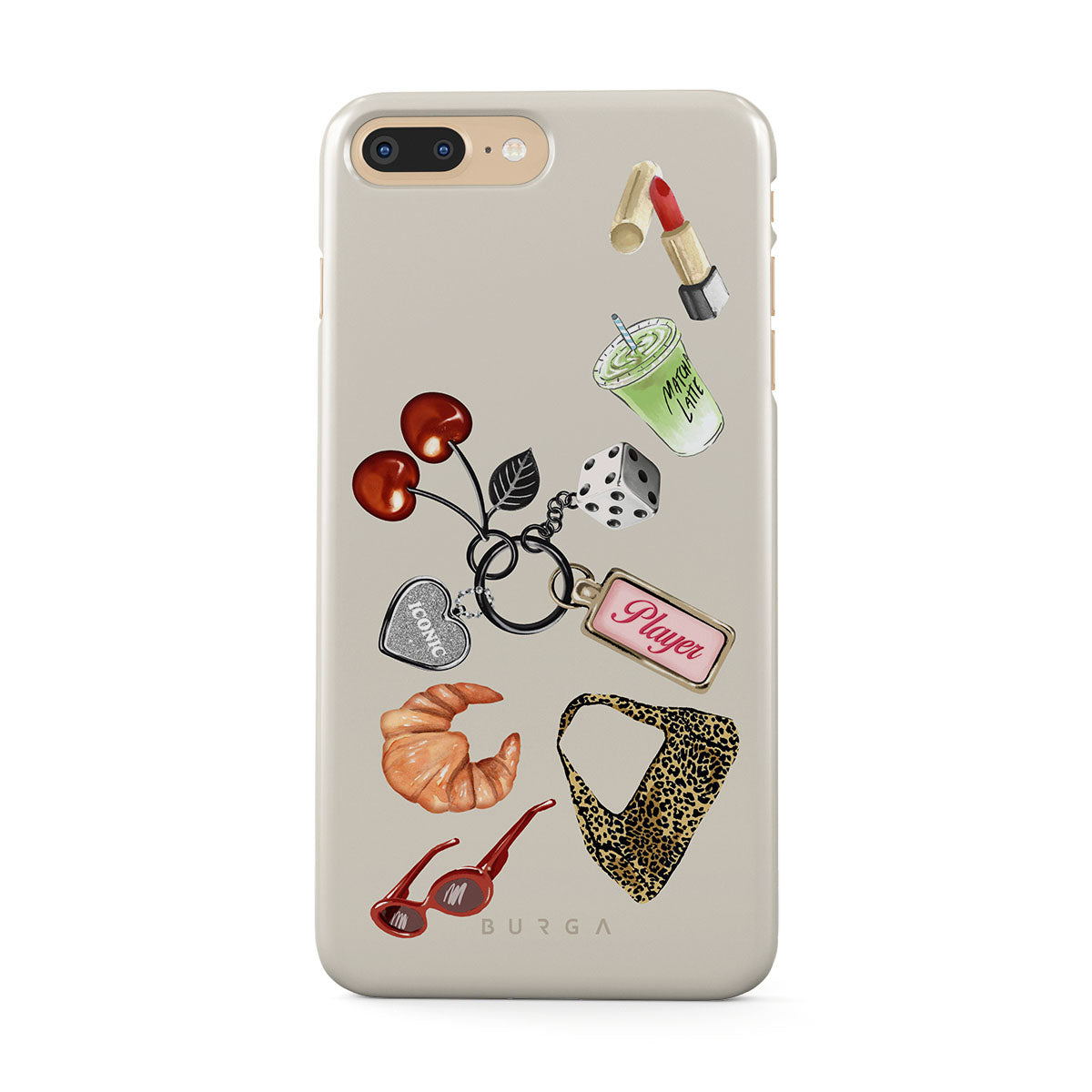 Kenmerken van dit design: rode zonnebril, rode lippenstift, groene matcha-drank, croissant, zwarte dobbelstenen, luipaardprint tas, sleutelhanger met zilveren hart, kersen, dobbelstenen en "Player"-tag.
