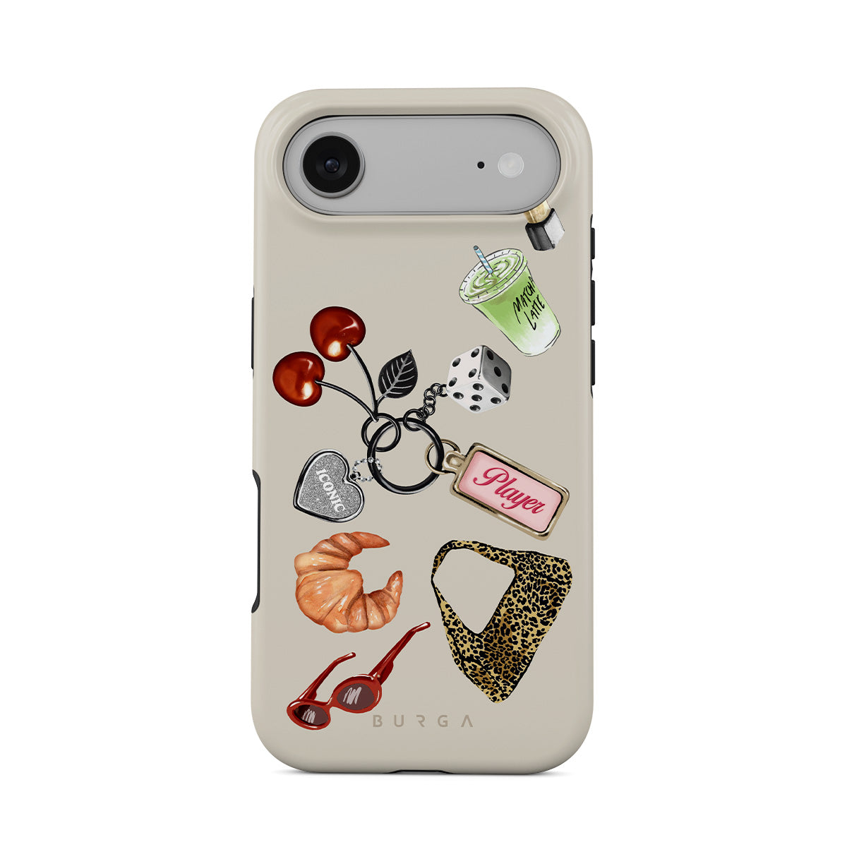 Kenmerken van dit design: rode zonnebril, rode lippenstift, groene matcha-drank, croissant, zwarte dobbelstenen, luipaardprint tas, sleutelhanger met zilveren hart, kersen, dobbelstenen en "Player"-tag.