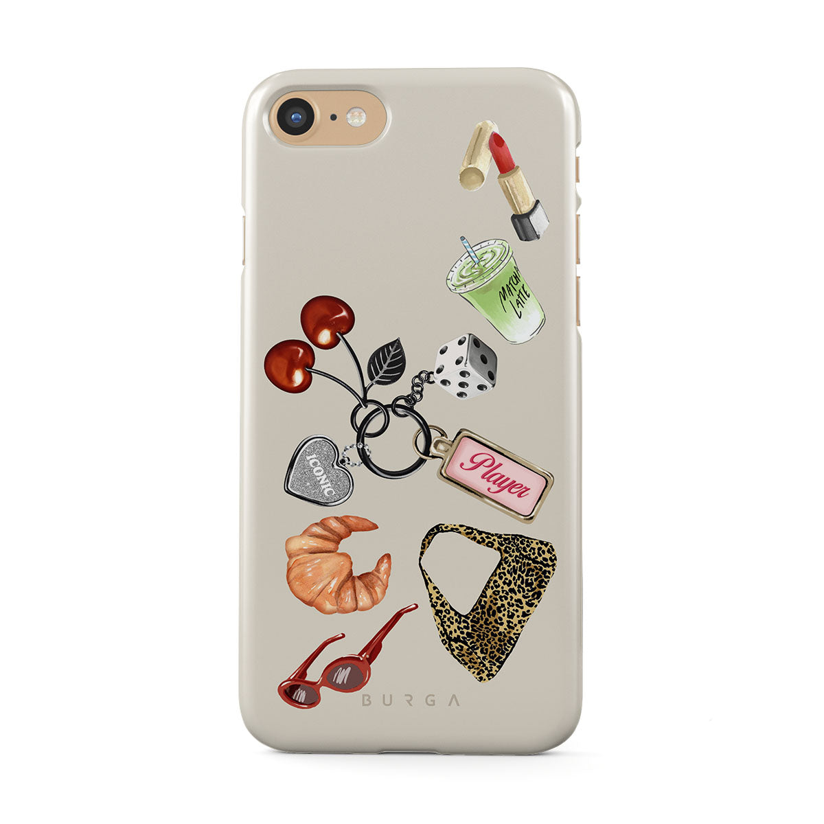 Kenmerken van dit design: rode zonnebril, rode lippenstift, groene matcha-drank, croissant, zwarte dobbelstenen, luipaardprint tas, sleutelhanger met zilveren hart, kersen, dobbelstenen en "Player"-tag.