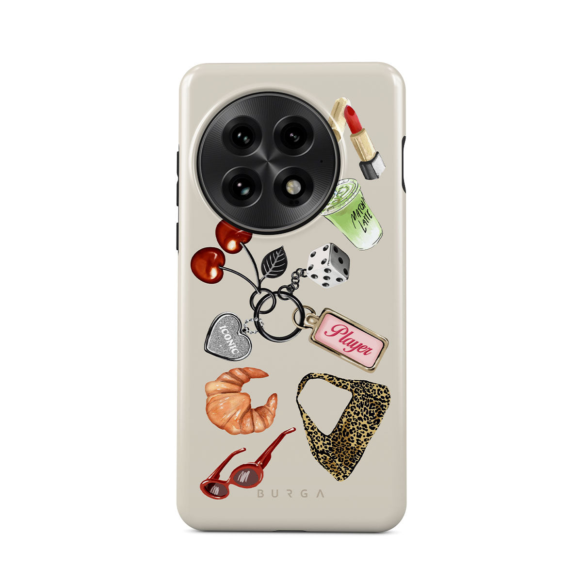 Kenmerken van dit design: rode zonnebril, rode lippenstift, groene matcha-drank, croissant, zwarte dobbelstenen, luipaardprint tas, sleutelhanger met zilveren hart, kersen, dobbelstenen en "Player"-tag.