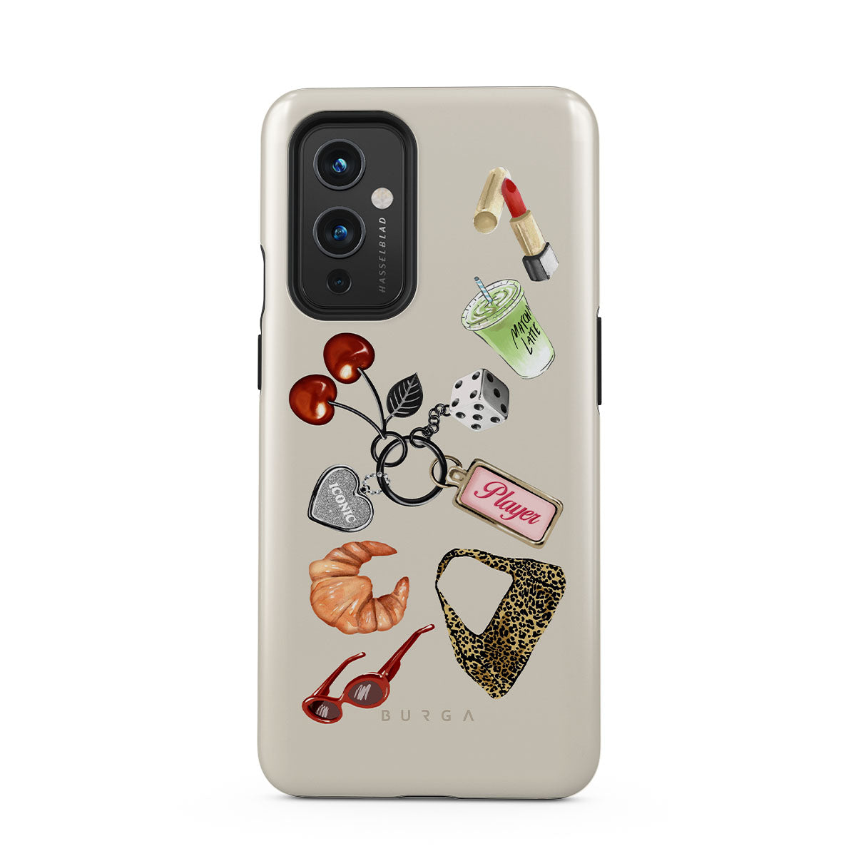 Kenmerken van dit design: rode zonnebril, rode lippenstift, groene matcha-drank, croissant, zwarte dobbelstenen, luipaardprint tas, sleutelhanger met zilveren hart, kersen, dobbelstenen en "Player"-tag.
