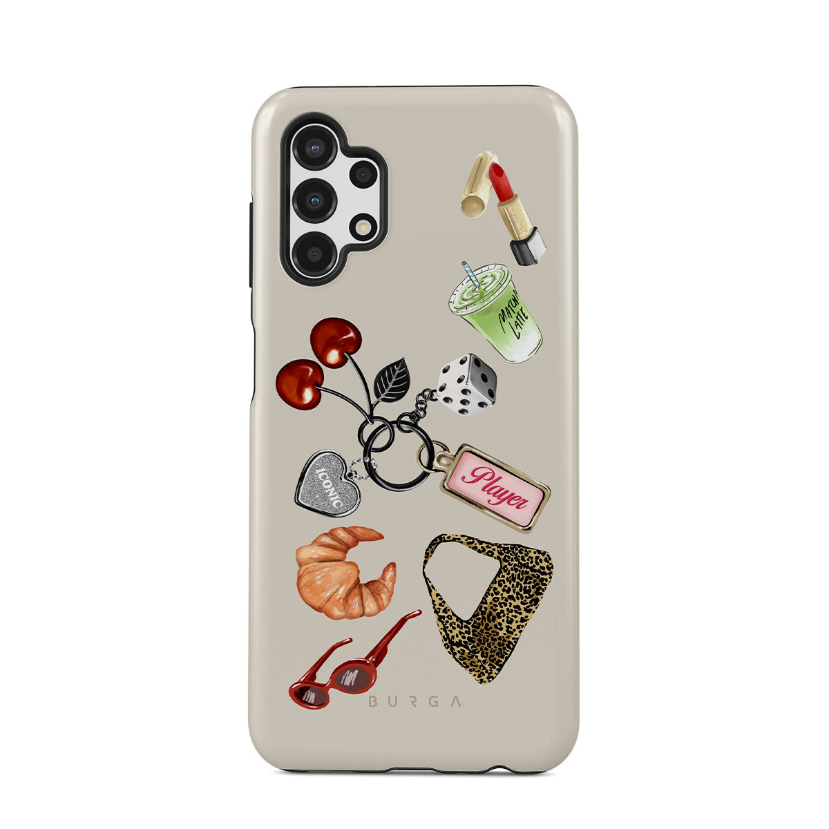 Kenmerken van dit design: rode zonnebril, rode lippenstift, groene matcha-drank, croissant, zwarte dobbelstenen, luipaardprint tas, sleutelhanger met zilveren hart, kersen, dobbelstenen en "Player"-tag.
