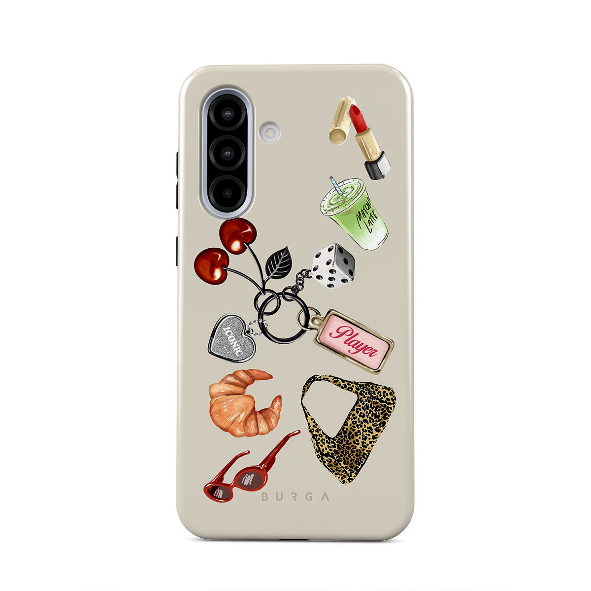 Kenmerken van dit design: rode zonnebril, rode lippenstift, groene matcha-drank, croissant, zwarte dobbelstenen, luipaardprint tas, sleutelhanger met zilveren hart, kersen, dobbelstenen en "Player"-tag.