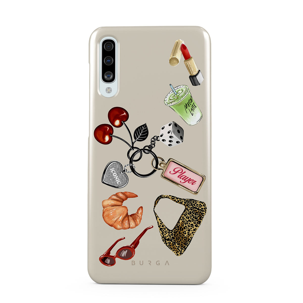 Kenmerken van dit design: rode zonnebril, rode lippenstift, groene matcha-drank, croissant, zwarte dobbelstenen, luipaardprint tas, sleutelhanger met zilveren hart, kersen, dobbelstenen en "Player"-tag.