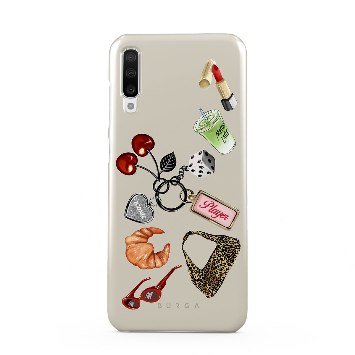 Kenmerken van dit design: rode zonnebril, rode lippenstift, groene matcha-drank, croissant, zwarte dobbelstenen, luipaardprint tas, sleutelhanger met zilveren hart, kersen, dobbelstenen en "Player"-tag.