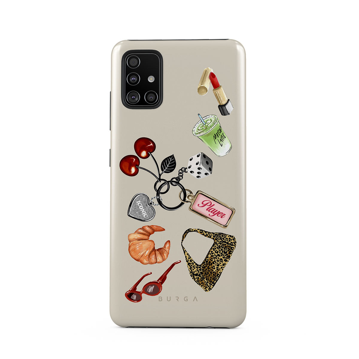 Kenmerken van dit design: rode zonnebril, rode lippenstift, groene matcha-drank, croissant, zwarte dobbelstenen, luipaardprint tas, sleutelhanger met zilveren hart, kersen, dobbelstenen en "Player"-tag.