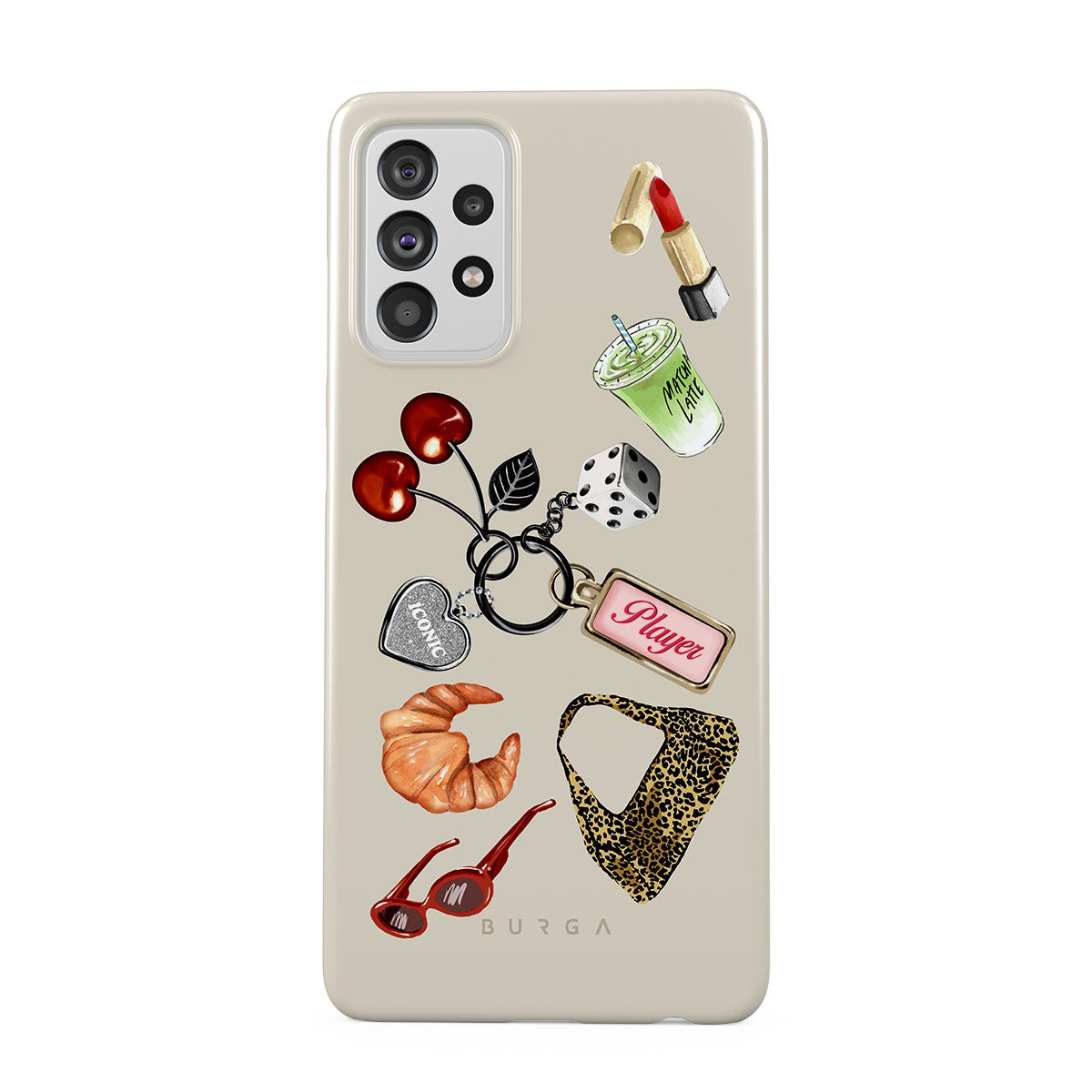 Kenmerken van dit design: rode zonnebril, rode lippenstift, groene matcha-drank, croissant, zwarte dobbelstenen, luipaardprint tas, sleutelhanger met zilveren hart, kersen, dobbelstenen en "Player"-tag.
