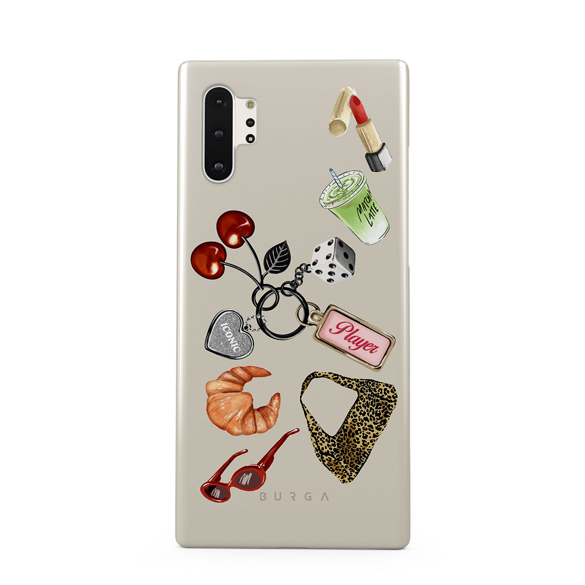 Kenmerken van dit design: rode zonnebril, rode lippenstift, groene matcha-drank, croissant, zwarte dobbelstenen, luipaardprint tas, sleutelhanger met zilveren hart, kersen, dobbelstenen en "Player"-tag.