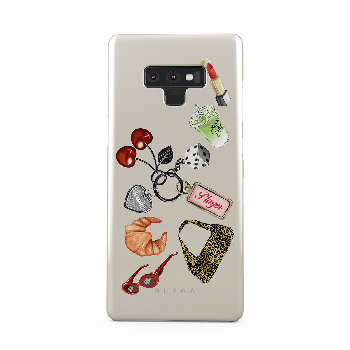 Kenmerken van dit design: rode zonnebril, rode lippenstift, groene matcha-drank, croissant, zwarte dobbelstenen, luipaardprint tas, sleutelhanger met zilveren hart, kersen, dobbelstenen en "Player"-tag.