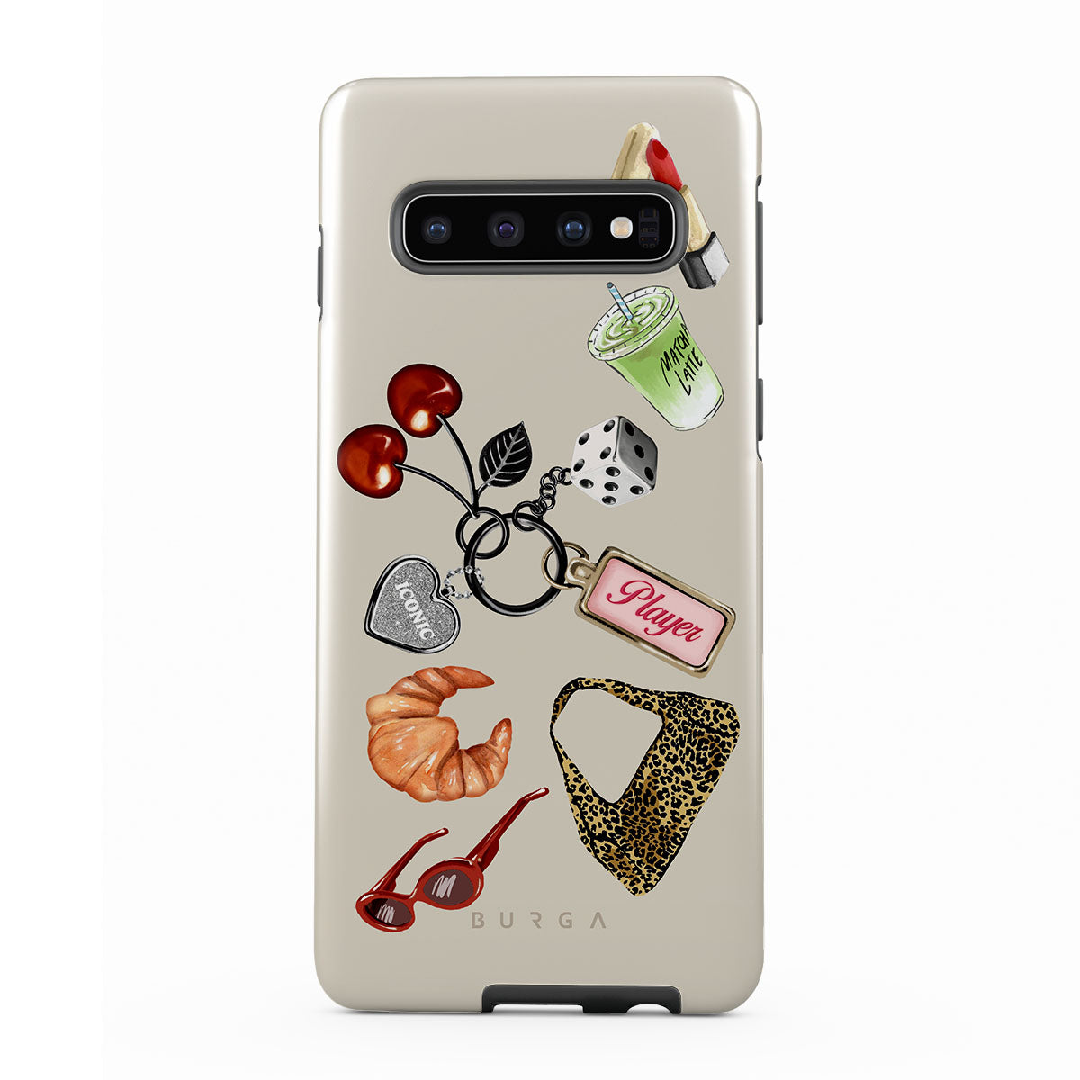 Kenmerken van dit design: rode zonnebril, rode lippenstift, groene matcha-drank, croissant, zwarte dobbelstenen, luipaardprint tas, sleutelhanger met zilveren hart, kersen, dobbelstenen en "Player"-tag.