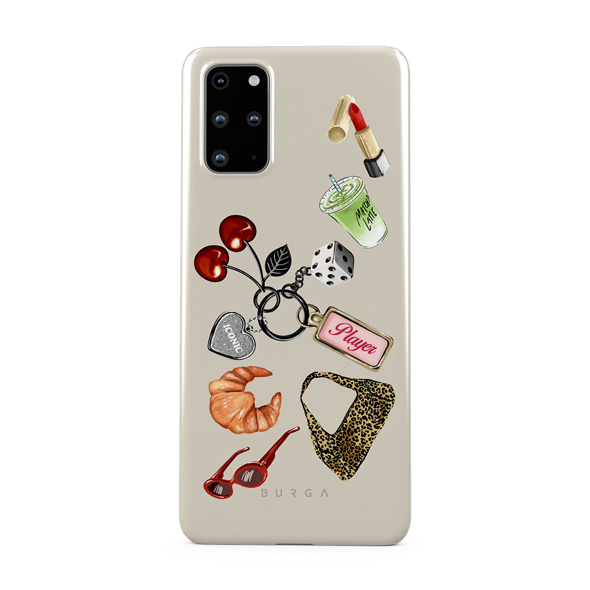 Kenmerken van dit design: rode zonnebril, rode lippenstift, groene matcha-drank, croissant, zwarte dobbelstenen, luipaardprint tas, sleutelhanger met zilveren hart, kersen, dobbelstenen en "Player"-tag.