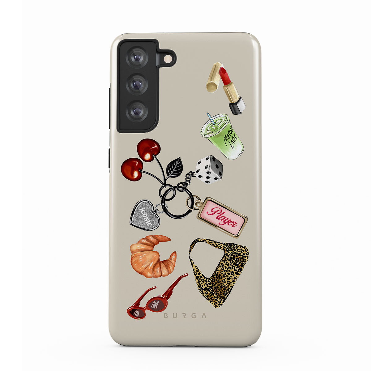 Kenmerken van dit design: rode zonnebril, rode lippenstift, groene matcha-drank, croissant, zwarte dobbelstenen, luipaardprint tas, sleutelhanger met zilveren hart, kersen, dobbelstenen en "Player"-tag.