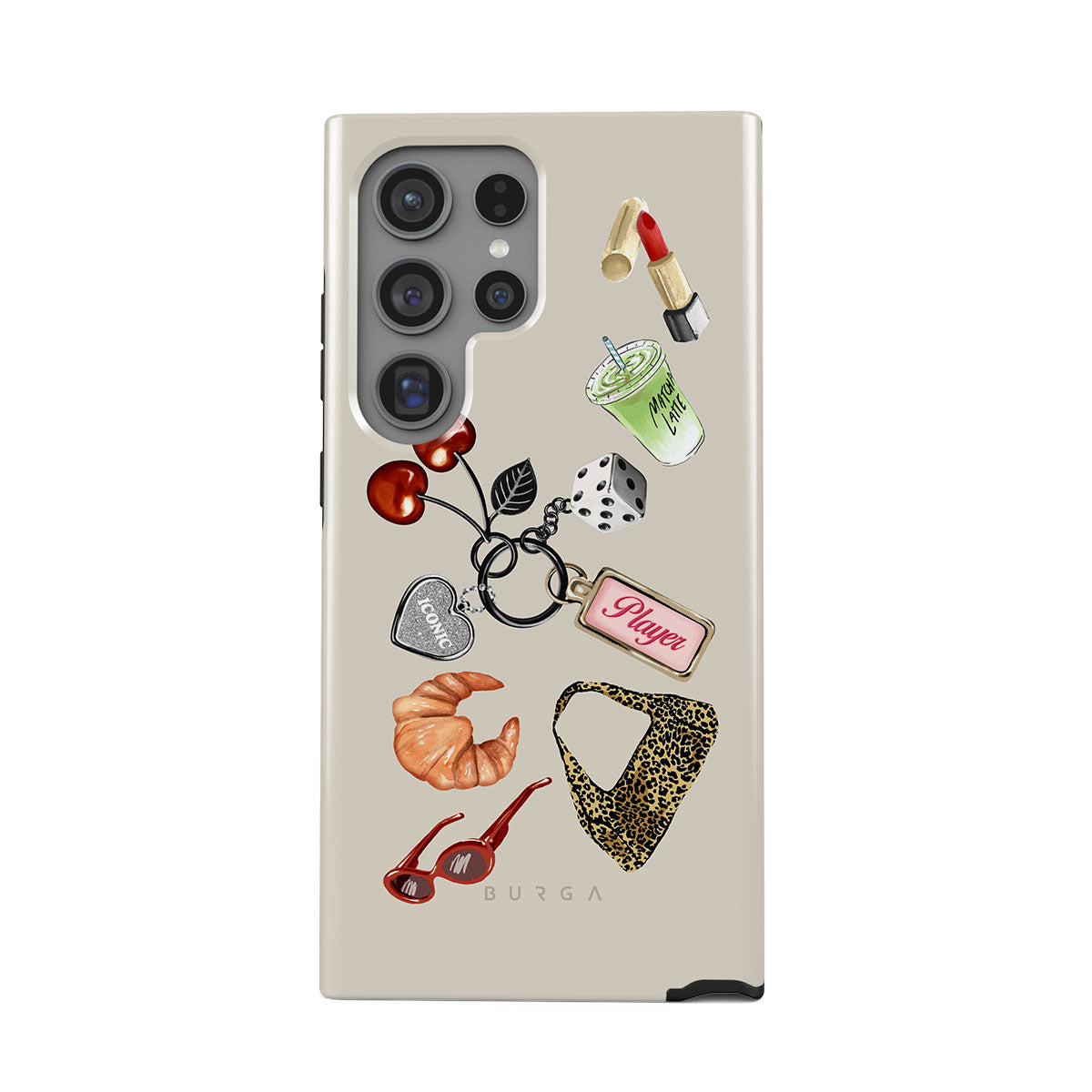Kenmerken van dit design: rode zonnebril, rode lippenstift, groene matcha-drank, croissant, zwarte dobbelstenen, luipaardprint tas, sleutelhanger met zilveren hart, kersen, dobbelstenen en "Player"-tag.
