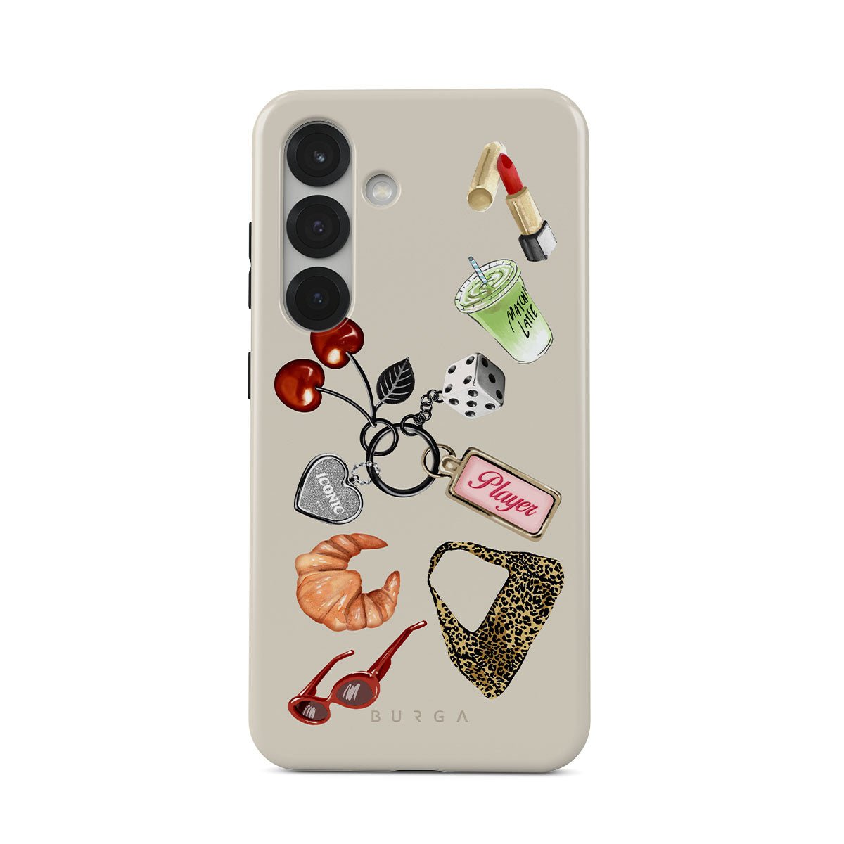 Kenmerken van dit design: rode zonnebril, rode lippenstift, groene matcha-drank, croissant, zwarte dobbelstenen, luipaardprint tas, sleutelhanger met zilveren hart, kersen, dobbelstenen en "Player"-tag.