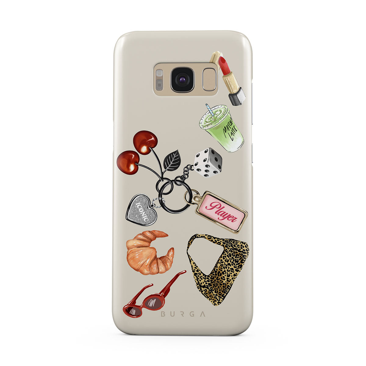 Kenmerken van dit design: rode zonnebril, rode lippenstift, groene matcha-drank, croissant, zwarte dobbelstenen, luipaardprint tas, sleutelhanger met zilveren hart, kersen, dobbelstenen en "Player"-tag.