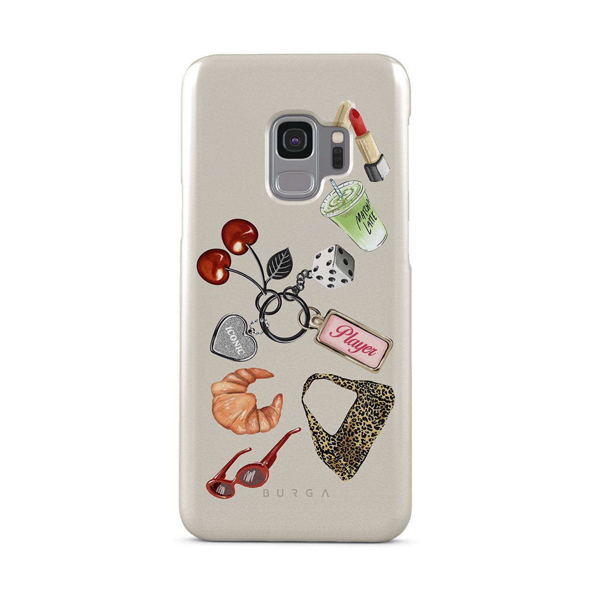 Kenmerken van dit design: rode zonnebril, rode lippenstift, groene matcha-drank, croissant, zwarte dobbelstenen, luipaardprint tas, sleutelhanger met zilveren hart, kersen, dobbelstenen en "Player"-tag.