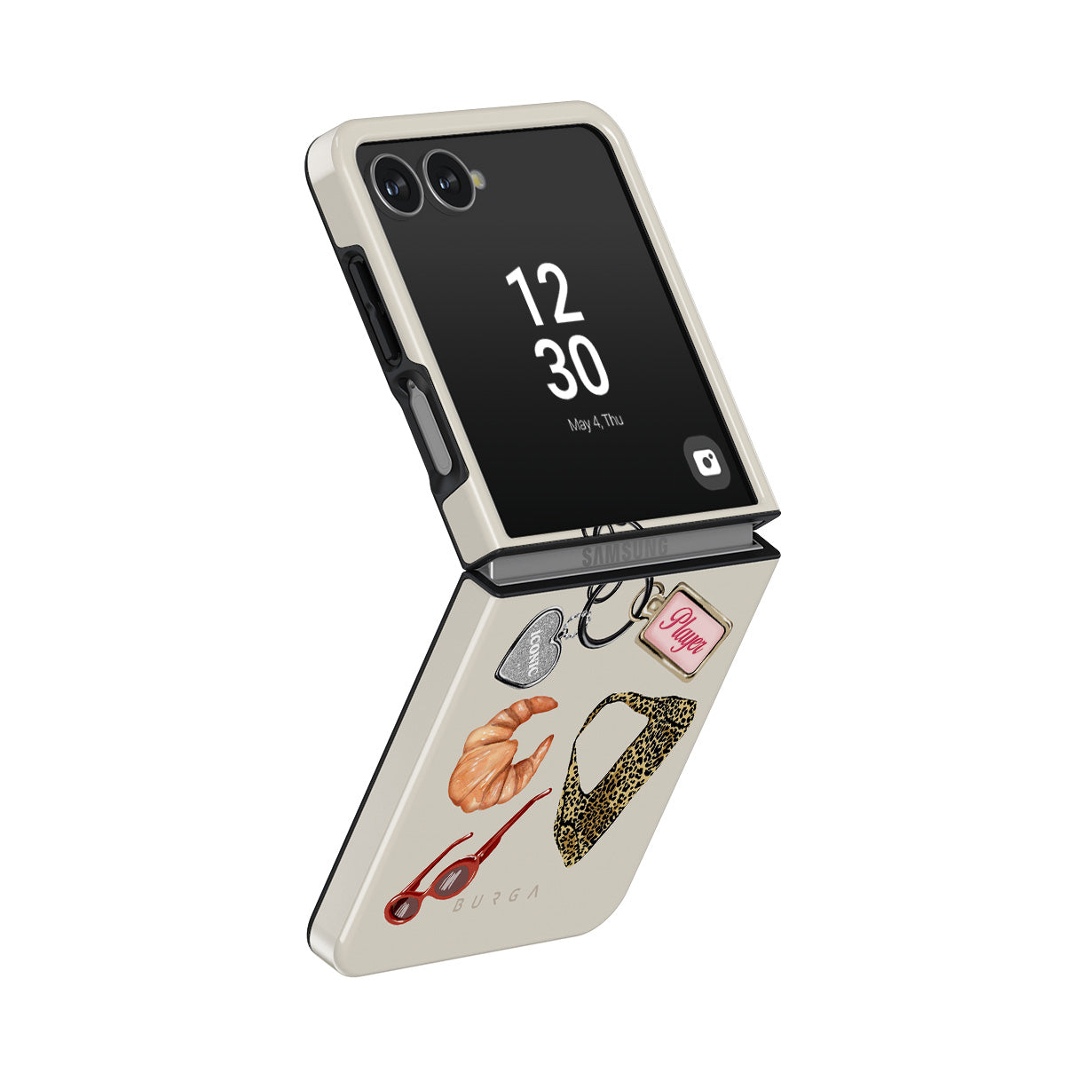 Kenmerken van dit design: rode zonnebril, rode lippenstift, groene matcha-drank, croissant, zwarte dobbelstenen, luipaardprint tas, sleutelhanger met zilveren hart, kersen, dobbelstenen en "Player"-tag.