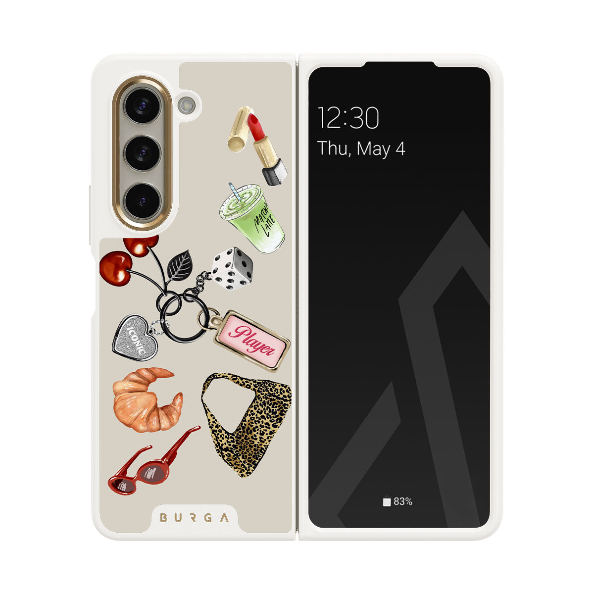 Kenmerken van dit design: rode zonnebril, rode lippenstift, groene matcha-drank, croissant, zwarte dobbelstenen, luipaardprint tas, sleutelhanger met zilveren hart, kersen, dobbelstenen en "Player"-tag.