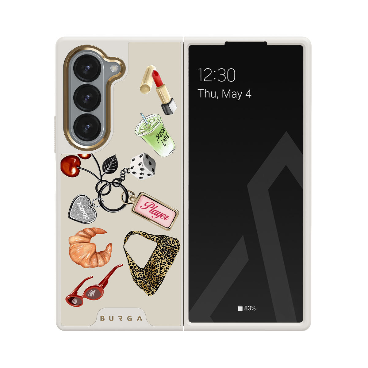 Kenmerken van dit design: rode zonnebril, rode lippenstift, groene matcha-drank, croissant, zwarte dobbelstenen, luipaardprint tas, sleutelhanger met zilveren hart, kersen, dobbelstenen en "Player"-tag.