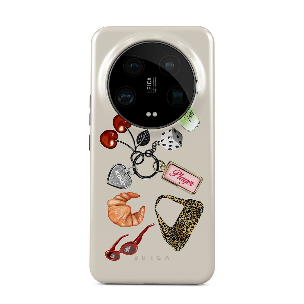 Kenmerken van dit design: rode zonnebril, rode lippenstift, groene matcha-drank, croissant, zwarte dobbelstenen, luipaardprint tas, sleutelhanger met zilveren hart, kersen, dobbelstenen en "Player"-tag.