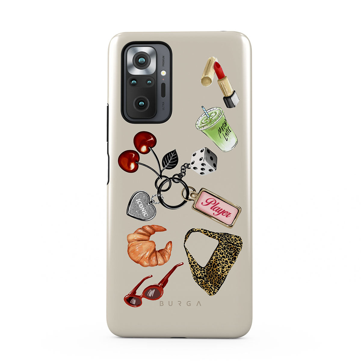 Kenmerken van dit design: rode zonnebril, rode lippenstift, groene matcha-drank, croissant, zwarte dobbelstenen, luipaardprint tas, sleutelhanger met zilveren hart, kersen, dobbelstenen en "Player"-tag.