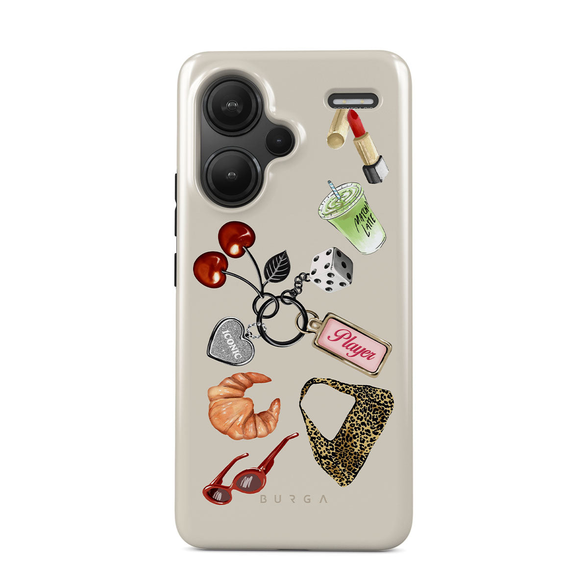 Kenmerken van dit design: rode zonnebril, rode lippenstift, groene matcha-drank, croissant, zwarte dobbelstenen, luipaardprint tas, sleutelhanger met zilveren hart, kersen, dobbelstenen en "Player"-tag.