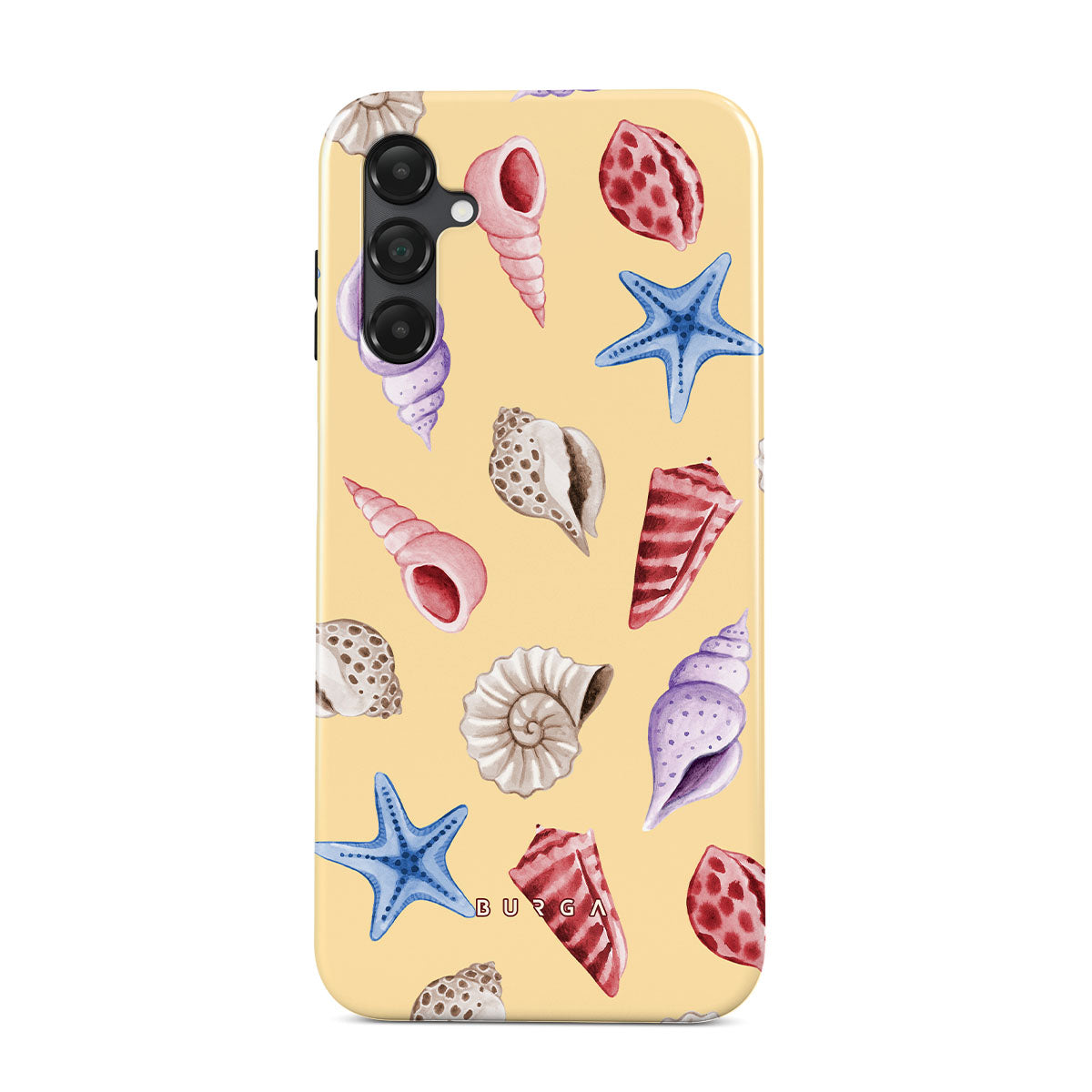 Kenmerken van dit design: schelpen, zeesterren, pastelgele achtergrond, oceaanthema.
