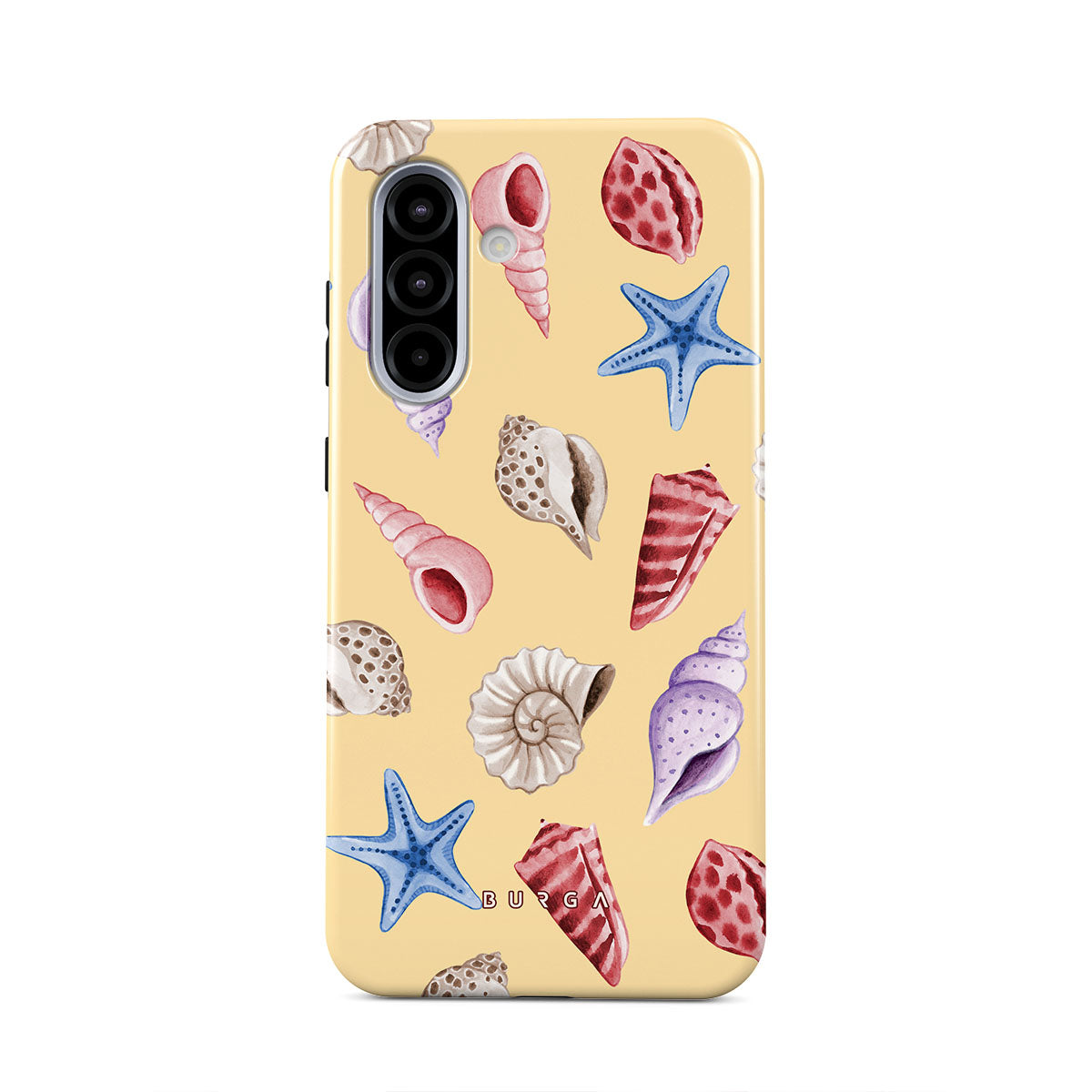 Kenmerken van dit design: schelpen, zeesterren, pastelgele achtergrond, oceaanthema.