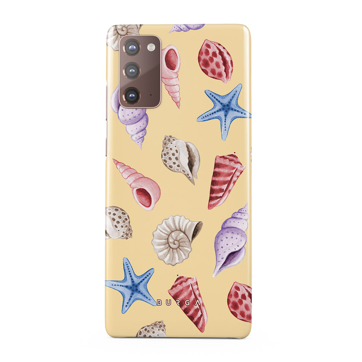 Kenmerken van dit design: schelpen, zeesterren, pastelgele achtergrond, oceaanthema.