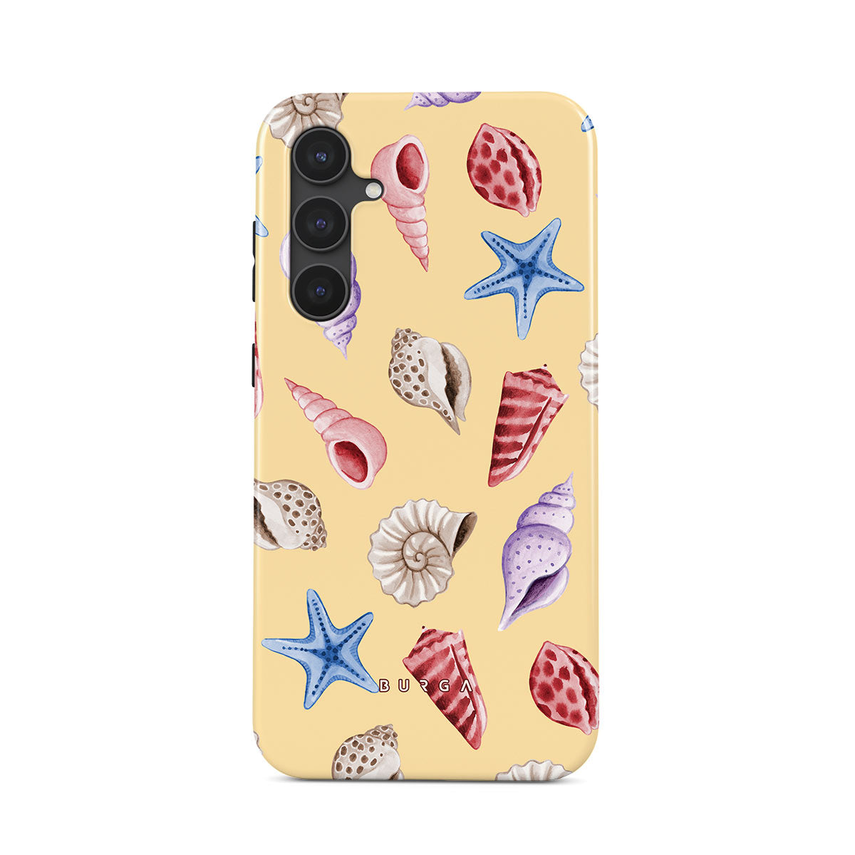 Kenmerken van dit design: schelpen, zeesterren, pastelgele achtergrond, oceaanthema.