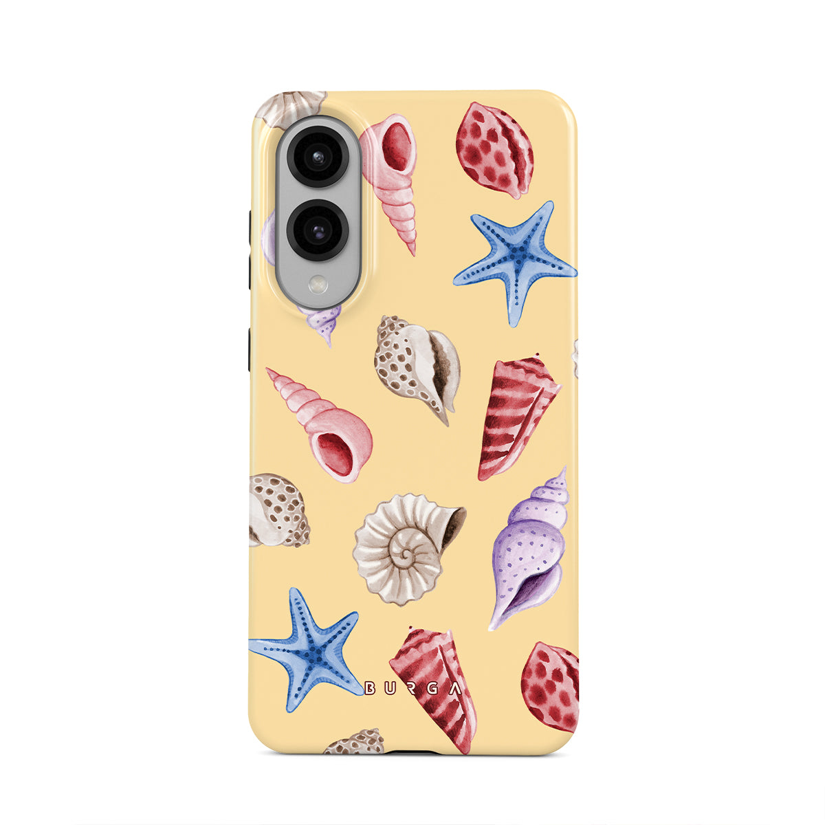 Kenmerken van dit design: schelpen, zeesterren, pastelgele achtergrond, oceaanthema.